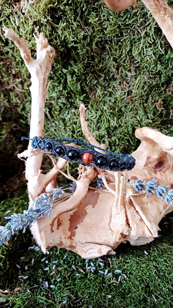 Matériaux : Fil linhasita, Jaspe rouge, Obsidienne noire, Quartz fumé, Tourmaline noire, acier inoxydable